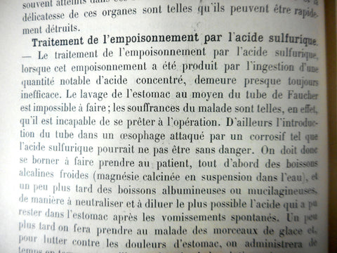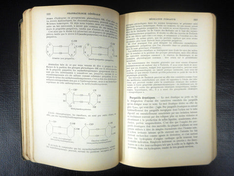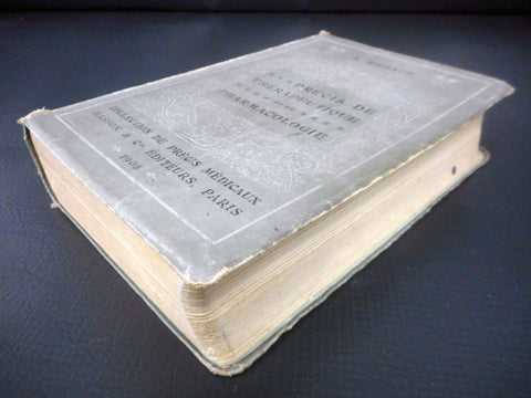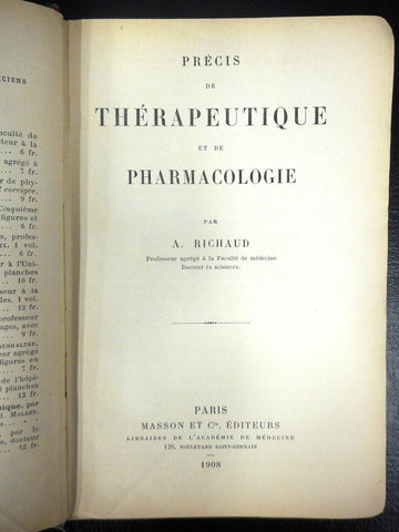 Excellent condition, complete, published in 1908 by Masson in Paris, France. Sturdy binding and cover, clean pages. 938 pages including medication definitions, chemical formula graphics and charts. Book written in French by Doctor A. Richaud, entitled Guide to Pharmacological Therapy ("Précis Thérapeutique, Pharmacologie"). Book was owned by Doctor Jacques Fortier, renowned doctor and author from Montreal (Quebec, Canada) in the early 1900's. First page is signed by him. We acquired his private collection of antique medical books.
