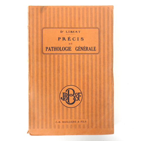 Complete, dated 1924, 143 illustrations and photos, 540 pages. Entitled "Préçis de Pathologie Générale" (General Pathology Details), written in French by Dr Libert, intern and teacher at the Medical Faculty of Paris, France. Subject: Genetic diseases and disorders with cases and examples. Published by Baillères & Fils. Acquired from the famous Montreal Fraser Institute Library when it closed.
