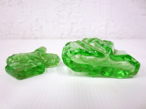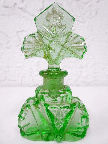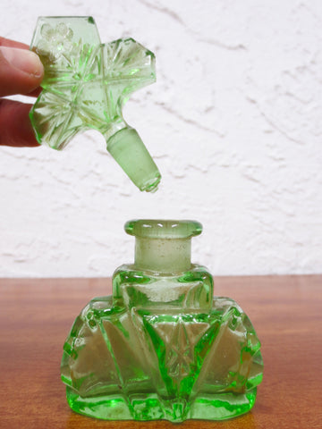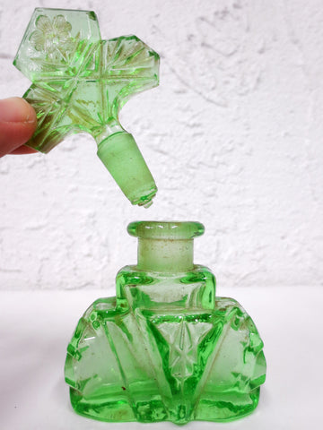Excellent condition, complete, no chips. Original clover flower perfume bottle from the 1930's. Glows in the dark under ultraviolet light, made with uranium glass (vaseline). Matching stopper, holds well on bottle. Beautiful hand cut glass details. Clean inside and out. Measures 4 1/2 X 2 1/2 X 1 inches.