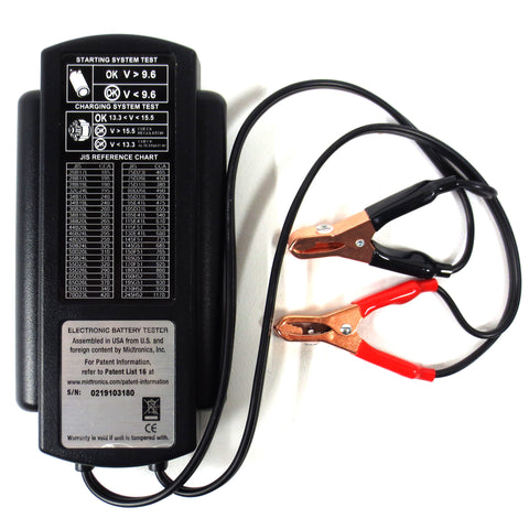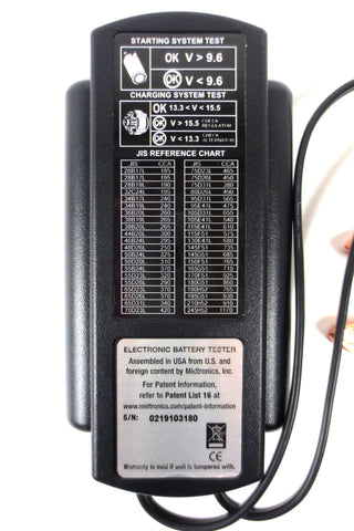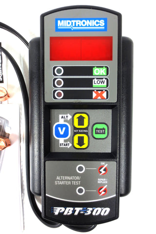 New, complete with instructions manual, warranty and red & black cable clamps. Advanced battery conductance electrical system tester by Midtronics, model PBT-300. For testing 12-volt automotive starting batteries rated in CCA, SAE, DIN, IEC & EN.