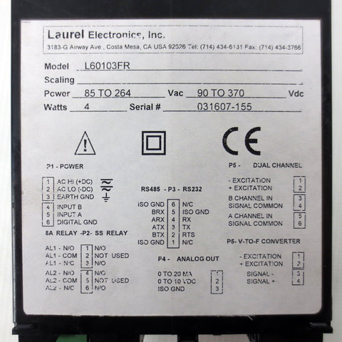 News, inspected and functional, no box. Surplus from an aluminum manufacturer. Panel meter controller by Laurel Electronics, model L60103FR. Specifications: Power 85 to 264 Vac, 90 to 370 Vdc, 4 Watts, Serial 031607-155. Compact size 3 3/4 X 1 7/8 X 4 3/4 inches and weighs 259 grams.
