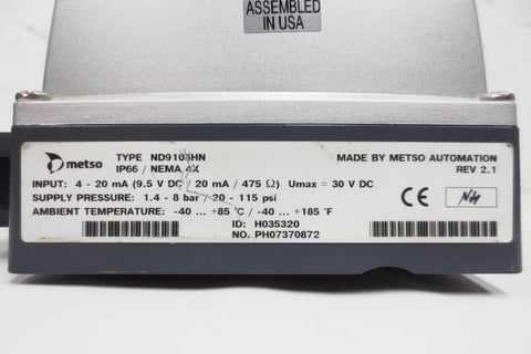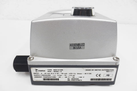 Like new condition, functional and very clean. Valve positioner/controller by Metso Neles Automation, Type ND9103HN, IP66, Nema 4X. Input: 4 - 20 mA (9.5 V DC / 20 mA / 475 Ω), Umax = 30 V DC. Supply Pressure: 1.4 - 8 bar / 20 - 115 psi. Ambient temperature: -40... +85 °C / -40 ... +185 °F. Weighs 1.86 kg and measures 5 1/2 X 6 3/4 X 4 1/2 inches.