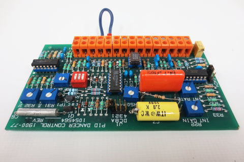 Tested, working, serviced and clean. This is a PID dancer control card by Boston Fincor, model 1900-77, 105456401 Rev B. Industrial surplus from a closing plant in Quebec, Canada.