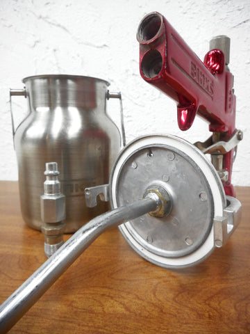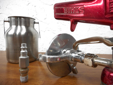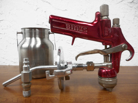 Excellent condition, professionally cleaned and tested. High quality used Binks BBR paint spray gun for professionals. Includes an AS20 Binks nozzle tip, a 4 inches diameter Binks suction feed cup and an air coupler with adapter. Dimensions of the spray gun: 6 1/2 X 8 1/2 X 2 inches. Very clean, small scratches and dings due to use. Red model.