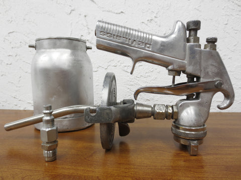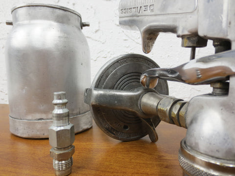 Excellent condition, professionally cleaned and tested. High quality used DeVilbiss JGA paint spray gun for professionals. Includes a #30 DeVilbiss nozzle tip, a 4 inches diameter DeVilbiss type KR suction feed cup and an air coupler with adapter. Dimensions of the spray gun: 6 1/2 X 8 1/2 X 2 inches. Very clean, small scratches and dings due to use.