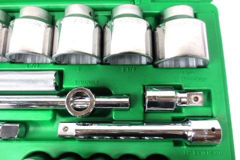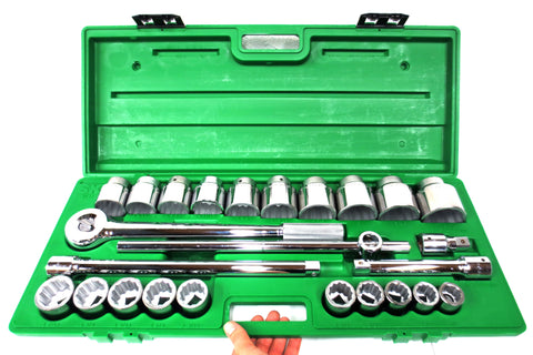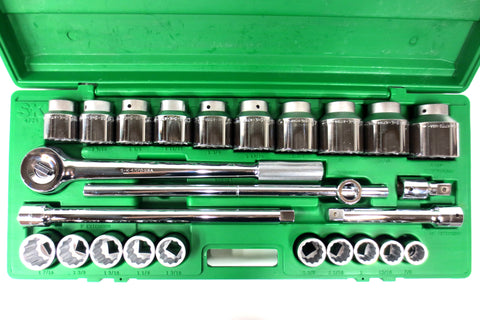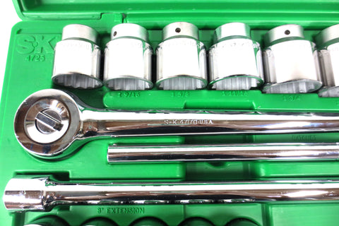 New, complete set with case, salesman sample from a tools distributor. 25 pieces 3/4" drive 12 point fractional drive socket set model 4725 by SK Professional Tools, made in U.S.A. High polish SuperKrome finish for maximum corrosion resistance and long life. SureGrip Drive Design drives the side of the fastener, not the corner, to provide increased strength. Set includes: