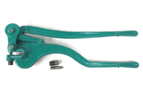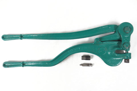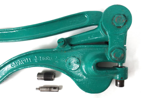 Fully functional, excellent condition, no rust. This deep sheet metal punch tool is signed Whitney Metal Tool Co. Rockford Illinois, Made in USA. Marked capacity 1/4 Thru 1/4 Iron. Measures 25 inches long and weighs 16 pounds. Comes with 2 clean punches and 2 dies that are easy to remove. Previous owner painted it with industrial green paint to protect it. Can easily be removed as needed.