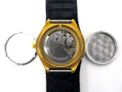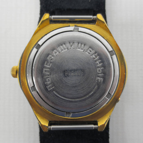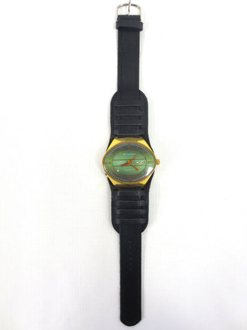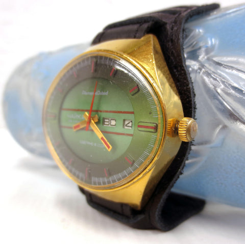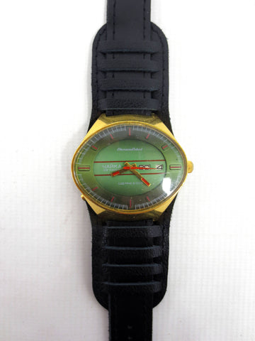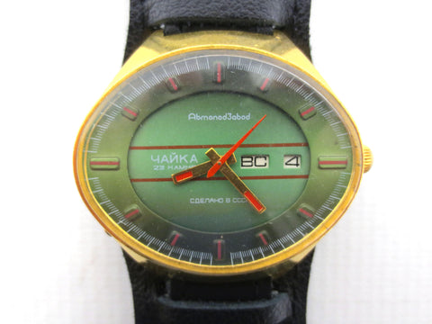 Remarkable condition, fully functional, ready to wear. This is a vintage 1970's Chaika automatic and gold plated watch from Russia with day and date and a push button to change it. Large 43 X 43 mm oval case with a green dial and gold and red arms. It has a black pilot leather band from Russia, size 18, 10.5 inches long. Crystal and case are in excellent condition, no cracks, no stains. Heavy and comfortable watch, definitely a head turner.