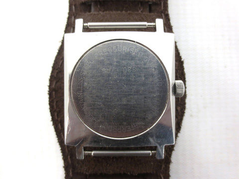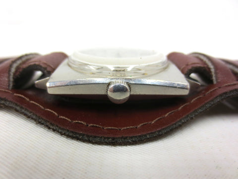 Rare Valgine pressurized 120 feet 3 ATM model made in Switzerland. Fully functional, great autonomy. Automatic 25 jewels watch with date. Unique square and thin case, measures 1 1/8 X 1 1/8 inches (29 X 29 mm). Crystal and case are in excellent condition, only light surface scratches. Comfortable brown leather pilot band. Back is marked "Pressurized Swiss 120 Feet 3 ATM Waterproof All Stainless Steel".