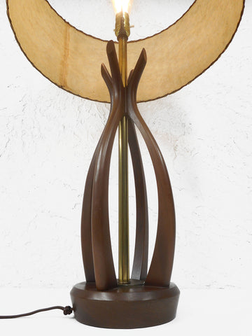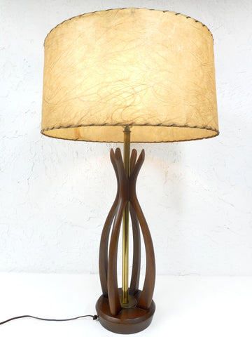 Excellent condition, unique design, ready to plug in. Tall 31 inches danish teak/walnut wood lamp from the 1950's. 4 tall wood spirals join to a neck. Gold tone center rod. Authentic 18 inches diameter fiberglass textured shade from the 1950's that produce warm light. Wires cleaned and inspected. New Edison style light bulb included. Great as center piece for your mid century living room.