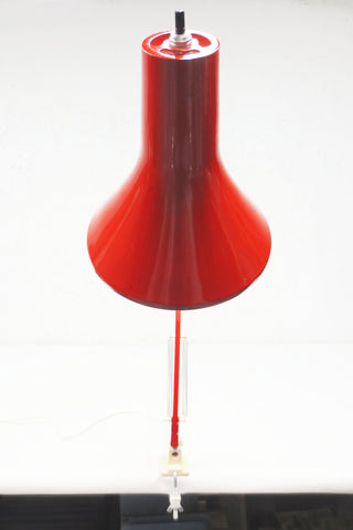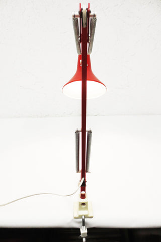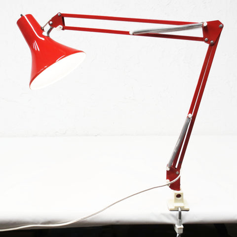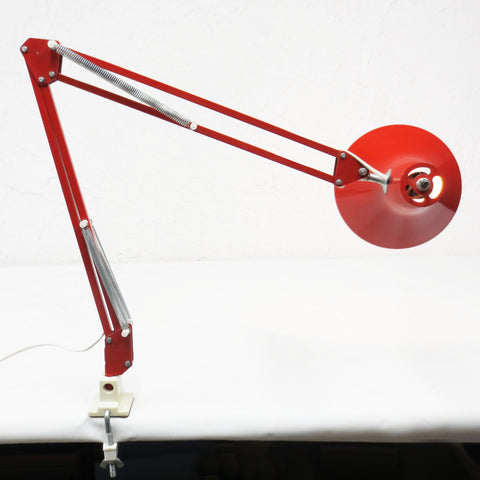 Excellent condition, original red paint, no dents, signed Luxo. Ready to plug in and clamp to your desk. 6 3/4" diameter shade. Long double 31" articulated arm with springs and knobs to adjust it. Original base and clamp included. Supports standard light bulbs up to 100 Watts (not included). Classic lamp for your home or office desk, saves space.