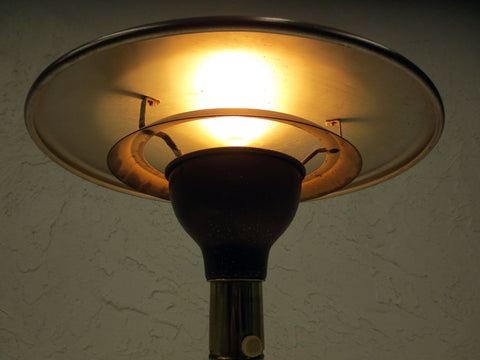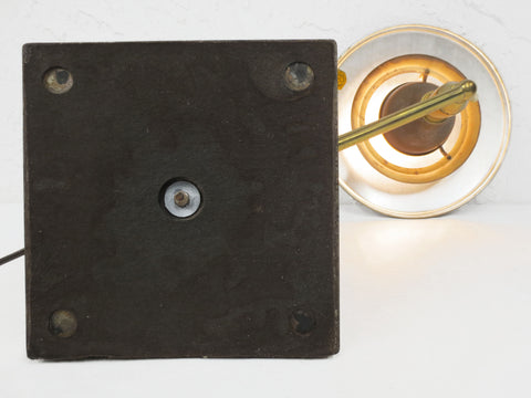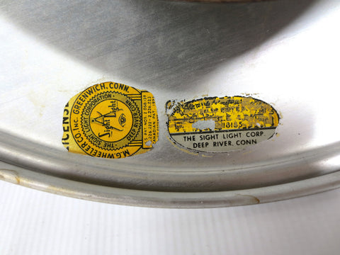 All original with tags, signed M.G. Wheeler Sight Light. Original brown and gold colors, ready to plug in, very clean. Swivels 360 degrees. Supports 100 Watts 3 way light bulbs. Very stable metal base and aluminum shade, no dents, no broken parts. Two original tags marked "M.G. Wheeler, Greenwich Connecticut, The Sight Light Corporation, Deep River Conn." Measures 14 inches tall, 9.25 X 9.25 inches base, 12.5 inches diameter shade.