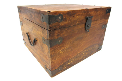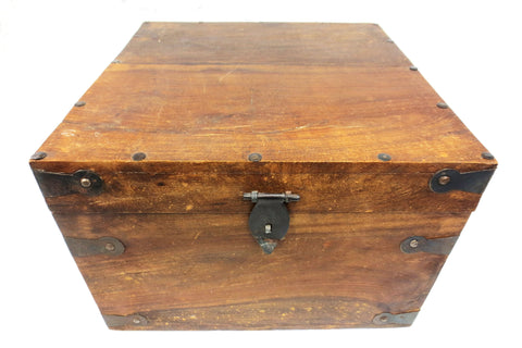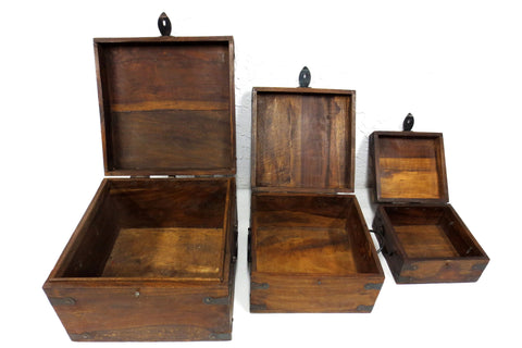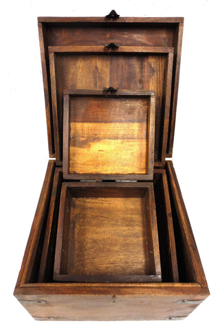 Perfect condition, handmade with exotic wood and iron hinges. Nested boxes, all 3 close well, biggest measures 12 7/8 X 12 7/8 X 9 inches. All pieces are assembled with handmade nails. Total weight 16 pounds.