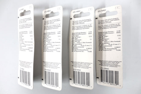 New, never opened, new old stock (NOS). 2 per package X4, total of 8. Lamp type #7219, bulb type T-1, 12V, 60mA, wire terminals base style, 25mm (1") base size, 0.5MSCP brightness, average life 10,000 hours. Used on projects such as model railroads. By RadioShack InterTan.