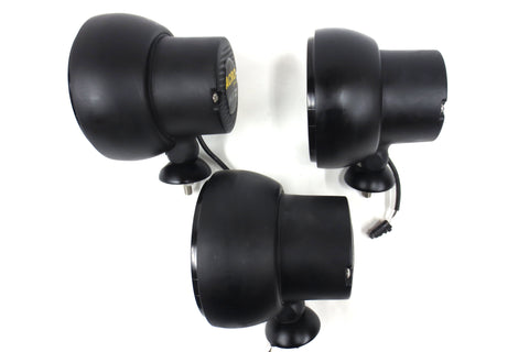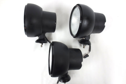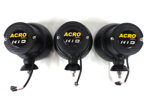 Excellent condition, matching set of 3, fully functional. High quality and powerful 3200 lumens (each) HID off road flood lights by Acro Lights, model A1830-W. 6 inches diameter, 5 3/4 in deep, 6 in tall. Matte black heavy duty cast aluminum housing. Stud mount, adjustable angle, bolts and washers included. Ballast & igniter already integrated into the lamps' housings, no other part required. 35W Xenon D2S bulb, 3200 lumens (each). 50% less energy consumption compared to convention off road lights. No paint loss, no dents, very light surface scratches. Acquired at auction in Montreal, Quebec from Canada National Defense. Each spotlight is worth between 360 and 400 USD.
