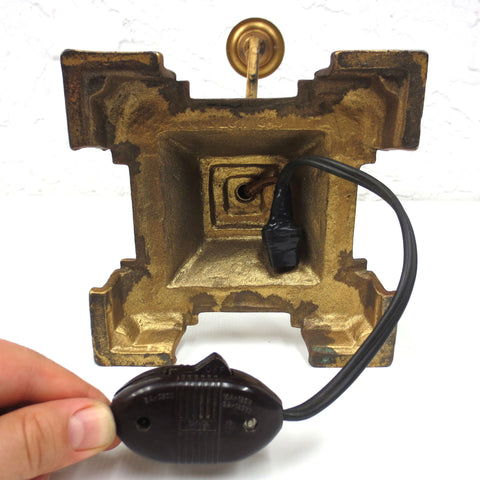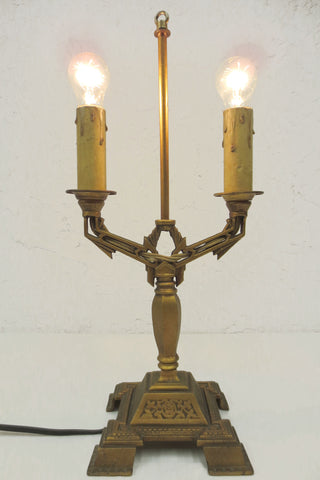 Excellent condition, clean and ready to plug in. Unique Art Nouveau design, original gold paint, ornate cast iron. On/off switch, wires inspected and cleaned. Lamp measures 19 inches tall, 9 in wide, 6 1/2 X 6 1/2 in base. Base is signed Flor 585. Original cardboard candle like light covers. Supports standard light bulbs up to 100 watts (not included). The center pole can be unscrewed if needed and has a nut on top to make it easy to add the shade of your choice (not included). Total weight 5 pounds.