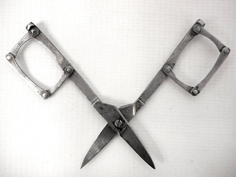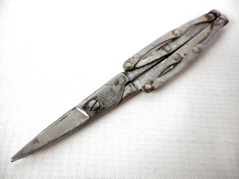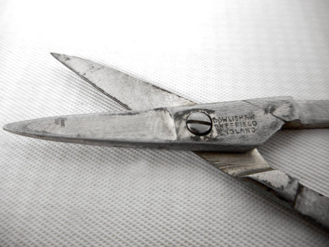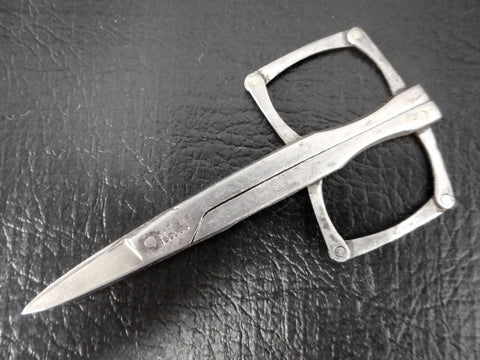 Clean, functional and sharp. Antique silver plated foldable scissors for Chatelaines, made in the late 1800's. Signed "Cowlishaw Sheffield England" and marked "Pat. No. 139086". Lovely and unusual square finger holes hinged in 4 places. Silver plating shows wear and age. Measures 3 1/4 X 1 1/2 inches unfolded.