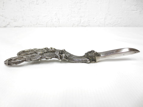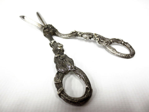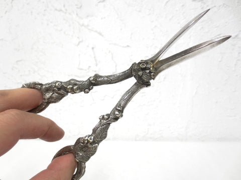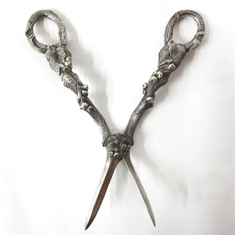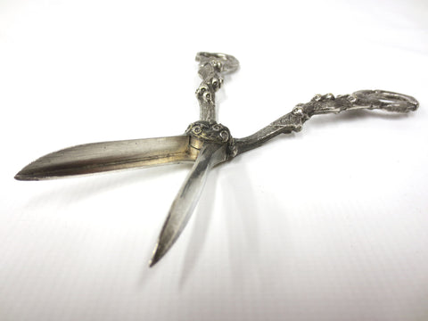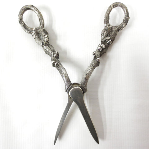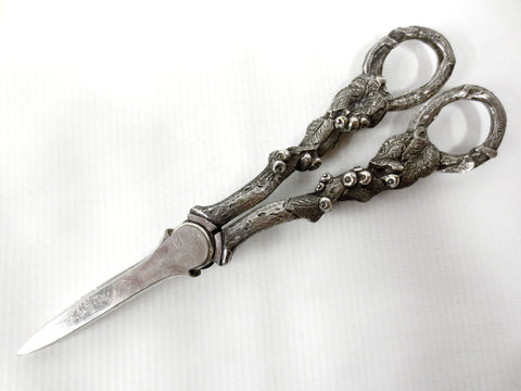 Excellent condition, still sharp and ready to use, heavy and high quality silver plating. Very ornate handles with hand hammered grapevines. Designed to cut grape stalks. Dimensions: 6 3/4 X 2 inches. Great addition to your classic table or to add to your scissors collection.