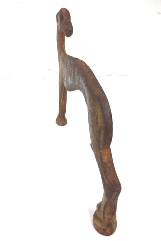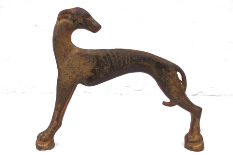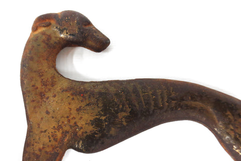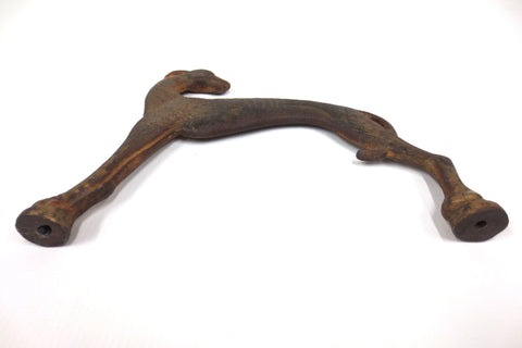 Antique Greyhound dog handle ornament from the 1920's. Original patina and gold paint, has screw holes under each foot. Very sturdy, no cracks, measures 7 3/8 X 6 X 5/8 inches and weighs 0.94 pounds. Can be displayed on your office desk, screwed on an antique portable table or be transformed into a dog bowl or bed handle.