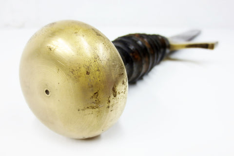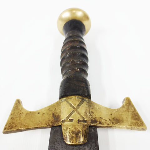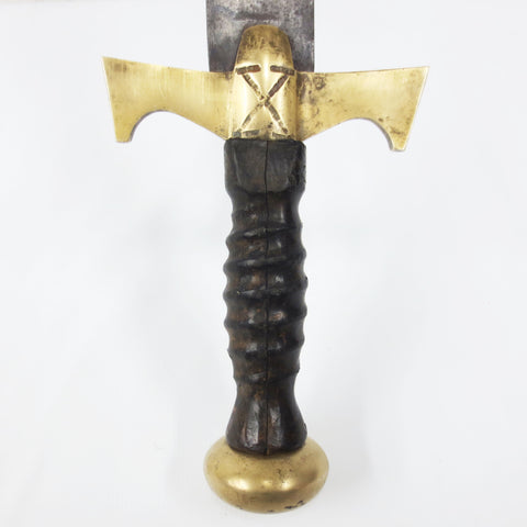 Excellent condition, no broken or loose parts. Hand engraved crucifix on one side, large 5 3/4" brass guard with the roman X numeral on each side. Has a rain guard (chappe), a ridged leather grip and a large brass pommel 2 1/4" diameter. Massive blade 22" long, 1 7/8" wide. Blade has no edges, no fuller and shows age. It appears to be a ceremony or decorative European riding sword. Origin unknown, found in Montreal, Quebec, Canada. Total weight 1.65 Kg.