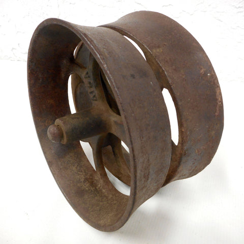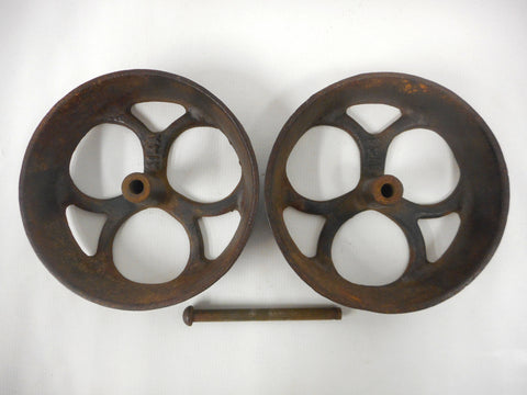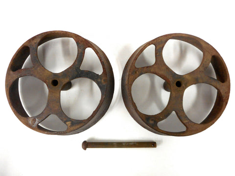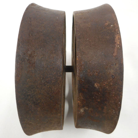 Excellent condition, no cracks, beautiful patina. Authentic cast iron wheels from an antique farm garden seeder. These 2 wheels are connected into one with a long bolt and are easy to separate as needed. Each wheel is marked A14A, has a 6 1/2" diameter and is 1 1/2 depth. For your steampunk projects and wall mount decor. These look great as lamp bases.