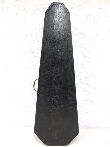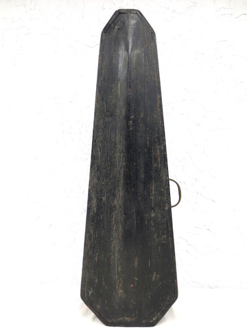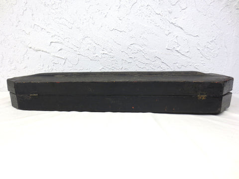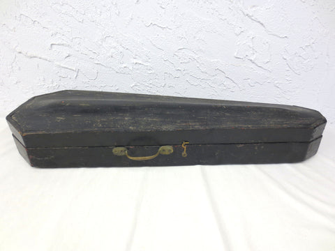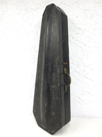 Unique Folk Art handmade wood case, sturdy, no cracks. Original paint preserved inside and out, interior cleaned. The shape of the violon center bouts and the bow holder are still there. Traces of green and blue felt. Great piece to showcase an old violon or a scary Halloween doll. Measures 30 x 4 x 9.5 inches and weighs 3.5 pounds.
