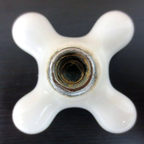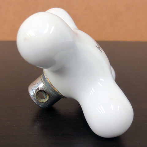 All original, porcelain in excellent condition, no cracks or chips. Antique Hot water knob. Solid brass base with chrome plating, fits round rods, no original tightening screw (new replacement provided). Knob measures 2 3/4 X 2 3/4 and is 1 1/2 inches deep.