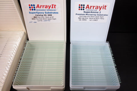 • 2 Arrayit boxes each containing 25 unused 3X1 in glass miccroscope slides.