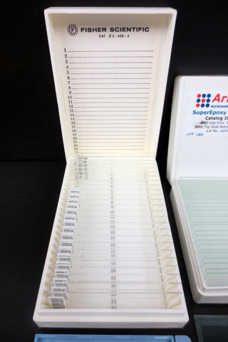 • 1 Fisher Scientific box containing 25 unused 3X1 inches glass microscope slides. 17 slides have barcodes.