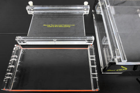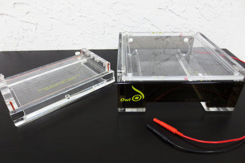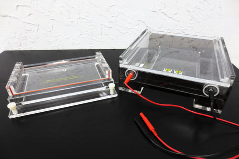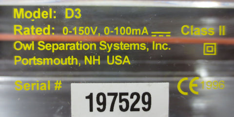 Excellent condition, very clean, no cracks. Wide gel electrophoresis system model D3 by Owl Separation Systems U.S.A., serial 197529. Health Canada surplus. Includes: