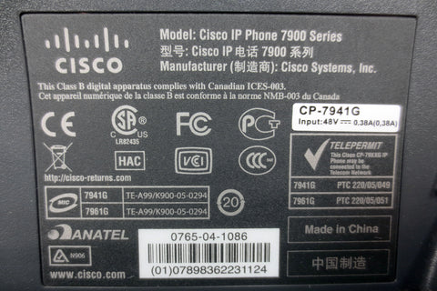 Refurbished and very clean, 12 pages manual included (pdf). Cisco IP phone model 7941 CP-7941G with its original adjustable footstand and handset. Large 4 X 3 inches LCD screen, quick footstand adjustment button, can also be screwed to a wall. Features: Programmable button, shows call features on screen, messages, directories, services, help, settings, volume headset, mute and speaker buttons. Supports a variety of power supplies 48V, 0.38A (not included). All units available are in the same condition (see our photos):  Fully functional, professionally cleaned, very light scratches only, no broken parts. Phone weighs 1.19 kg and measures 11 X 8 1/2 X 4 inches when footstand is closed.