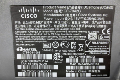 Refurbished and very clean, 12 pages manual included (pdf). Cisco IP phone model 7942 CP-7942G with its original adjustable footstand and handset. Large 4 X 3 inches LCD screen, quick footstand adjustment button, can also be screwed to a wall. Features: Programmable button, shows call features on screen, messages, directories, services, help, settings, volume headset, mute and speaker buttons. Supports a variety of power supplies 48V, 0.38A (not included). All units available are in the same condition (see our photos): Fully functional, professionally cleaned, very light scratches only, no broken parts. Phone weighs 1.19 kg and measures 11 X 8 1/2 X 4 inches when footstand is closed.