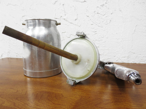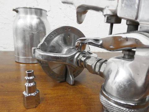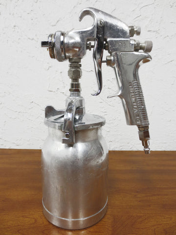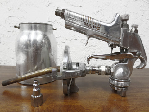 Excellent condition, professionally cleaned and tested. High quality used DeVilbiss JGA paint spray gun for professionals. Includes a #30 DeVilbiss nozzle tip, a 4 inches diameter DeVilbiss type KR suction feed cup and an air coupler with adapter. Dimensions of the spray gun: 6 1/2 X 8 1/2 X 2 inches. Very clean, small scratches and dings due to use.
