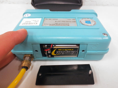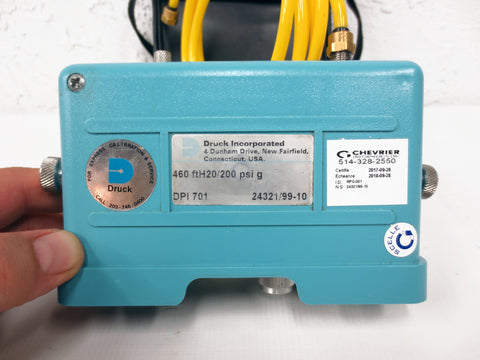 Calibrated and certified, excellent condition, fully functional. Portable digital pressure indicator by Druck, model DPI 701. Original carrying case with safety screws, long tube and connectors. Works with a standard 9V battery (included). Measures 460frH20/200 psi g. From a closing pharmaceutical plant in Montreal, Quebec.