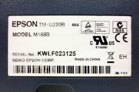Working, very clean. Original Epson power cable and phone cord included. Epson commercial POS receipt printer TM-U220B, model M188B, serial KWLF023125. ERC38 ink ribbon (costs $8) and paper roll required (not included).