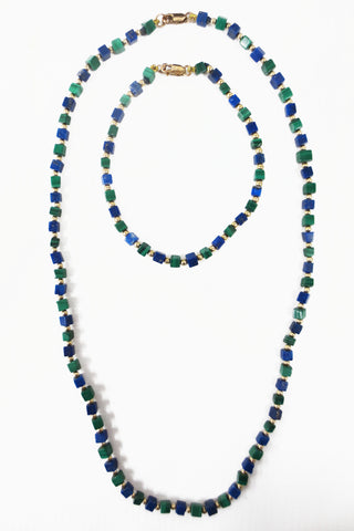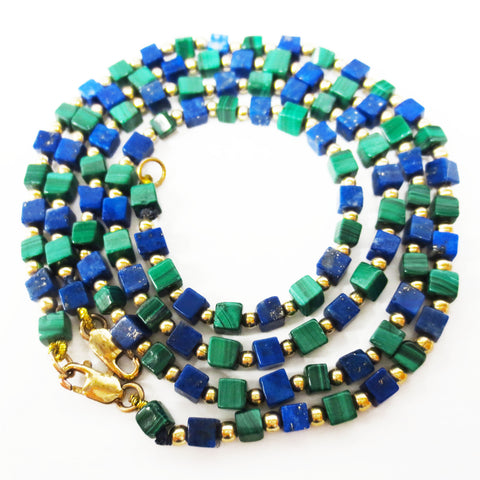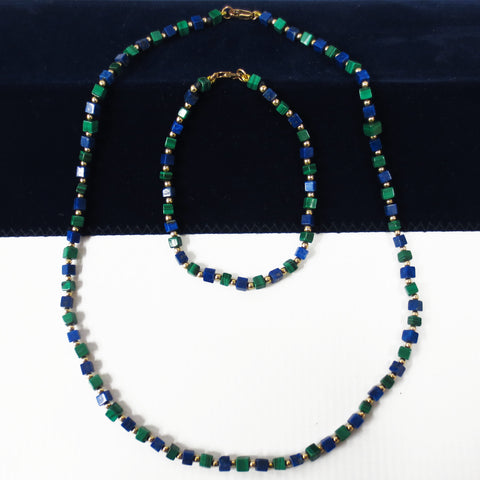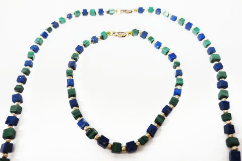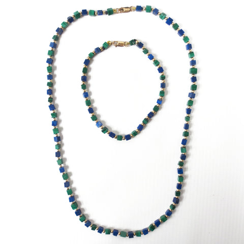 Acquired in Chile in 2010, excellent condition, necklace measures 16" and bracelet 7" long. Genuine green Malachite and blue Lapis Lazuli 3 mm square beads. 14k gold filled beads and clasps.