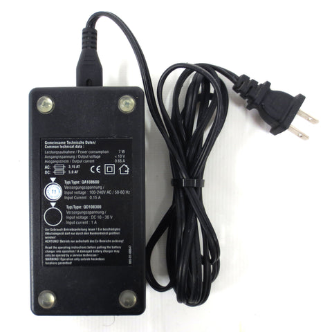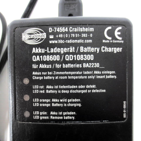 Fully functional battery charger made in Germany by HBC Radiomatic. Model QA108600 / QD108300 for batteries BA223030 and BA223000. Plugs into a standard type A electrical outlet.