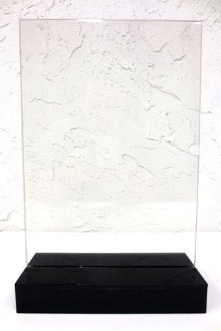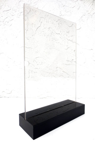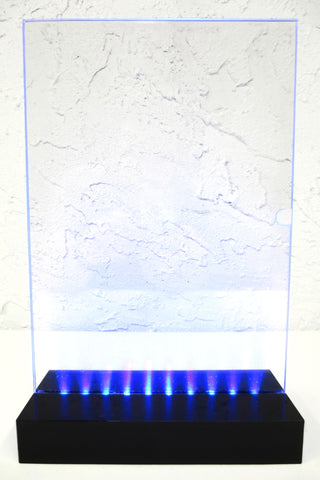 New, works with 3X standard AA batteries, self standing. On/off button, 10 powerful blue LED lights, plexiglass fits 8 1/4 x 11 1/2 papers, photos and printed plastics. Total size 8 3/8 X 13 X 3 1/4 inches including the black plexiglass base. Ideal to showcase a menu, wine and cocktails list, advertising, personal photo or collectible. Designed for hotels, restaurants, cafe, bars as well as for individuals who organize chic evenings at home. Batteries not included.