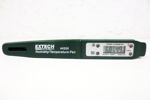 Fully functional, very clean, battery included (357). Humidity/Temperature Pen by Extech Instruments, model 44550. Shows results in Fahrenheits and Celsius. On/off and max/min buttons. Measures 6 inches long. Surplus from Health Canada.