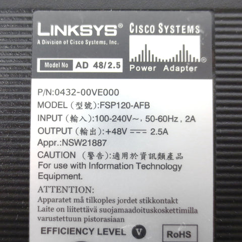 Like new, original Linksys Cisco Systems AC adapter charger. Model FSP120-AFB, part number 0432-00VE000. Ouput: 48V, 2.5A. Input 100-240V, 50-60Hz, 2A.
