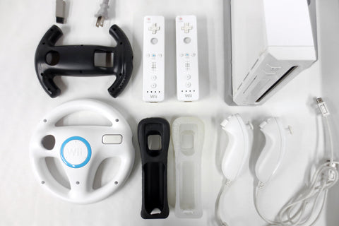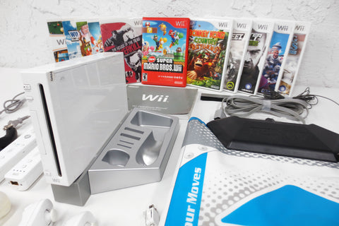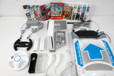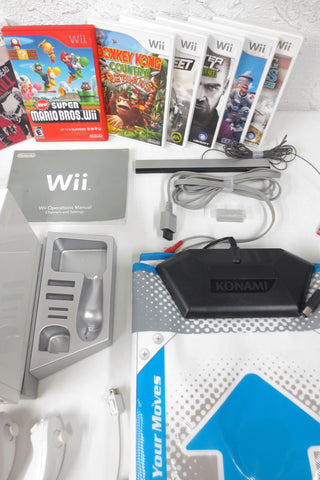 Very clean, complete, fully functional. Wii console Model RVL-001 with its manual, all wires and motion sensor. Includes: 11 games, 2 remotes and their rubber covers, 2 nunchucks, 2 steering wheels, 1 Konami floor mat for dance games, 1 stand and remote rest, 1 motion sensor, 1 power supply and 1 tv connector (red/white/yellow). Games are all functional, 8 still have their booklet: Super Mario Bros, Donkey Kong Country Returns, Need for Speed Pro Street, House of the Dead Overkill, Splinter Cell Double Agent, Wipeout, Blazing Angels, Redneck Jamboree, Planet 51, Wii Play and Winter Sports.