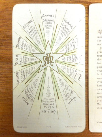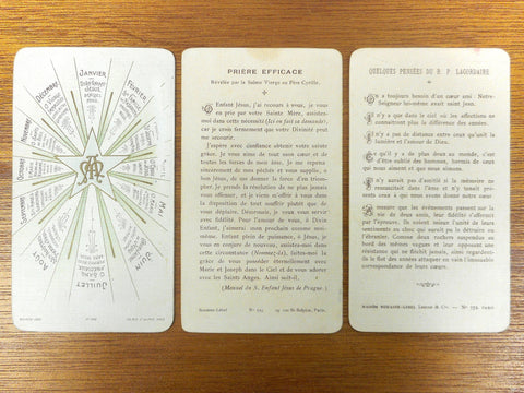 All 3 Christmas cards are in perfect condition, no handwriting. Printed by Bouasse-Lebel in Paris in the 1910's and 1920's. Beautiful lithographs and colors. Written in French. Each card measures 4 1/2 X 2 3/4 inches and has 4 pages. Year of Happiness and Prayer Calendar, Merry Christmas and Efficient Prayer, All My Wishes, Thoughts and Prayers by Lacordaire.