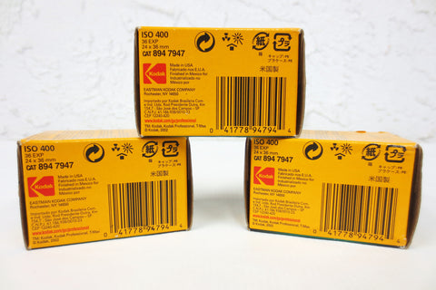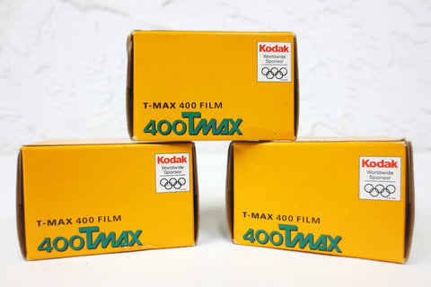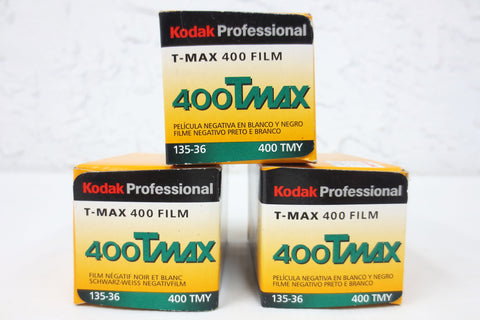 Unopened, new old stock (NOS). 3 Kodak Professional T-Max 400 TMY 135-36 black & white 35mm negative films. Iso 400, 36 EXP, 24 X 36mm. Dated May 2009.