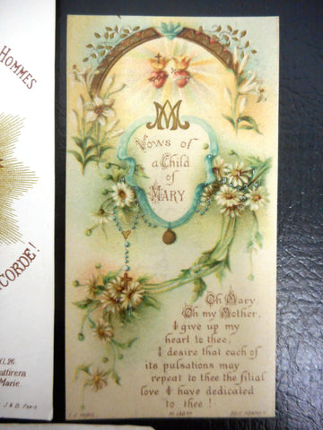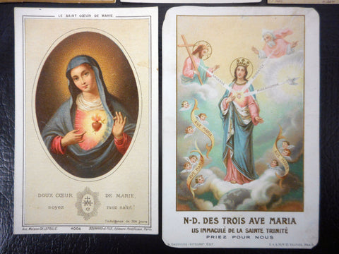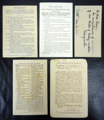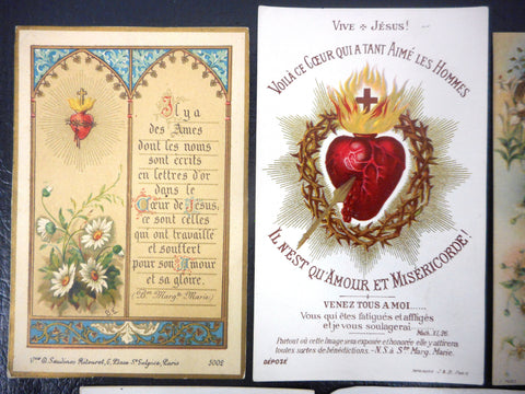 All 5 holly cards are in mint condition, no handwriting. Printed with beautiful gold paint details in the 1910's in Paris by Letaille, Boumard et fils and Saudinos Ritouret, renowned pontifical editors and printers. The english card is dated 1915 on back with a note concerning the birth of a child. 4 cards are written in French, 1 in English. They all measure approximately 4 to 4 1/2 by 2 to 2 3/4 inches. Theme on all cards is the Sacret Heart of Jesus: Vows of a Child of Mary, Here is the Heart that Loved Men so Much, Souls' Names written in Gold on Jesus' Heart, Notre-Dame of the 3 Ave Maria, Sweet Heart of Mary.