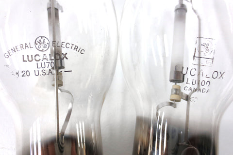 5 new high pressure sodium light bulbs with Mogul bases. Includes: General Electric GE Lucalox LU70, LU100 and LU400, Sylvania Lumalux LU250/Eco S50 et LU400 S51. Surplus from an industrial light fixture distributor in Montreal (Quebec, Canada).