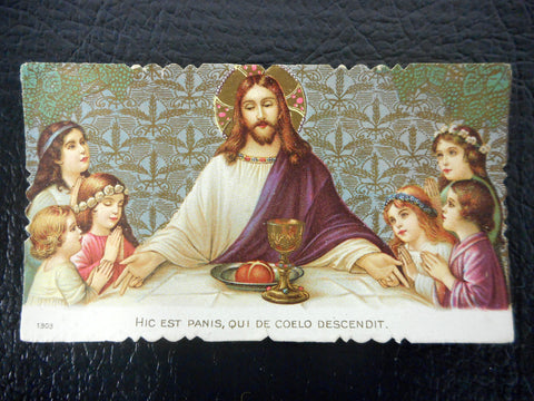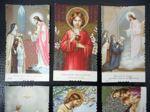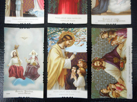 All 6 holly cards are in mint condition and from the same series. Each one is numbered, in Latin and measures 3 1/4 X 2 inches. Printed in Italy in the 1920's. Beautiful colors and gold paint details. Depicts different scenes of Jesus' Journey: Bread that Comes Down from Heaven, Taste and See the Lord, Holly Trinity and One God, Angels will Nurish your People.