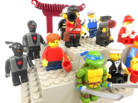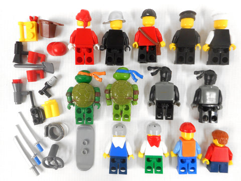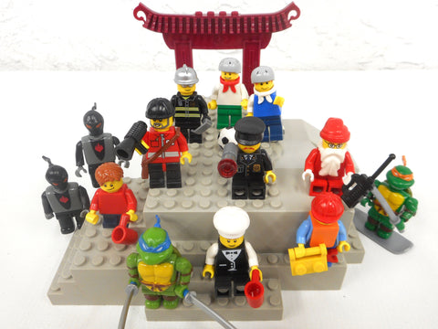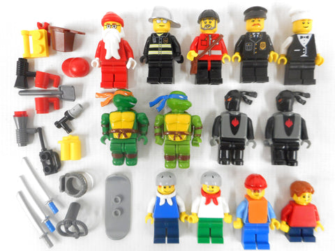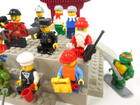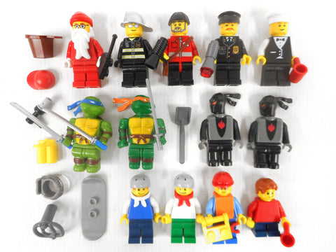 All 13 minifigures and 17 accessories in excellent condition, very clean, none broken. Includes 2 Ninja Turtles with 3 swords and a snowboard, a disguised Santa Claus, construction workers, officers, a cook and more. Also includes accessories such as diving equipment, coffee cups, a back basket, police speakers and more. The grey base is not included.