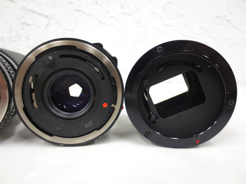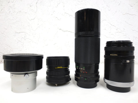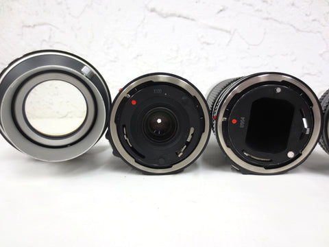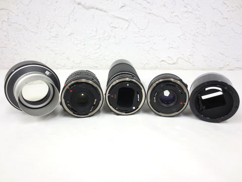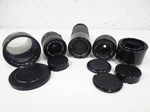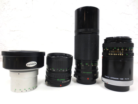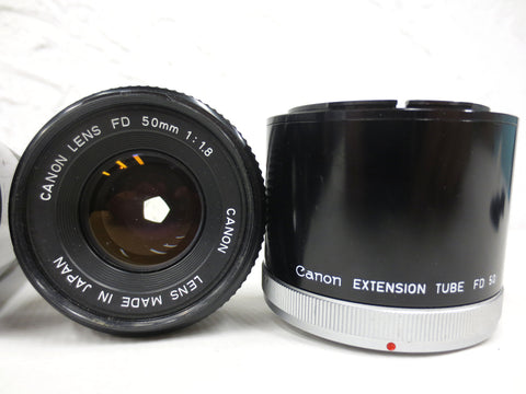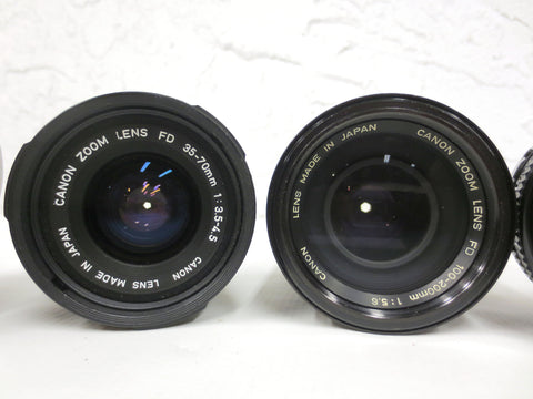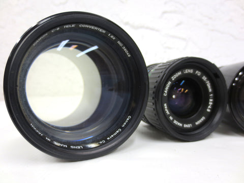 3 original Canon FD mount zooms, a Tele Converter and an Extension tube. Clean and clear lenses, fully functional. Includes 3 Canon FD zooms: 35-70mm 3.5-4.5, 50mm 1.8 and 100-200mm 5.6. Also a Canon C-8 Tele Converter 1.6X and a Canon 50mm FD mount extension Tube that fits. 4 original Canon lens caps that fit some of the zooms are also provided. The Canon FD lens mount is a standard for connecting lenses to a 35mm single-lens reflex camera body. This mount standard was developed by Canon in Japan and introduced in 1971 with the Canon F-1 camera.
