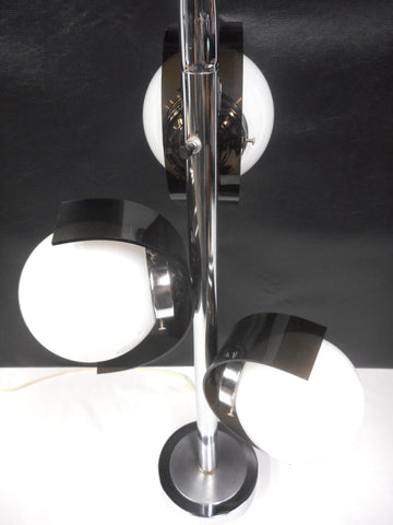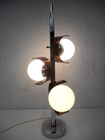Excellent condition, spectacular, 34 inches tall. Ready to plug in, high quality porcelain sockets that support light bulbs up to 100 Watts. Authentic mid century table lamp, Reggiani and Eames style, unsigned. All chrome with 6 inches diameter white glass globes and translucent acrylic petals. Switch allows to open 1, 2 or 3 lights. Great pieces for a mid century living room or office.