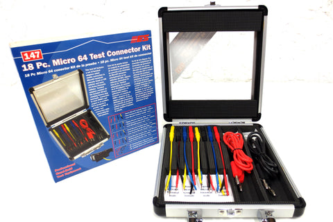 New professional 18 piece Micro 64 test connector kit by Electronic Specialties, model 147. See-through case included. This test kit features a set of terminal adapters which enable connection to Micro64 terminals primarily found on GM vehicles and some EU/Asian/Domestic vehicles. Terminal adapters connect via the included 48 inch stacking banana plug test leads. Connection to most DMM's and scopes is no problem. Kit is designed to provide a quality & secure test connection while quickening the test process.